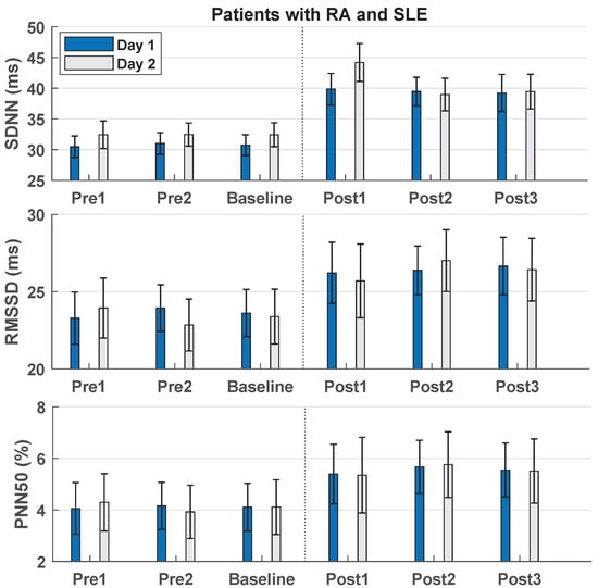 Looking at the baseline measurements, the patients with RA and SLE had lower SDNN (31 milliseconds) and RMSSD (24 milliseconds) compared to normal values reported for healthy adults (SDNN: 50 milliseconds and RMSSD: 42 milliseconds) []. The healthy participants in this study had a baseline SDNN (57 milliseconds) and RMSSD (43 milliseconds) comparable to normal values in healthy adults []. This supports the fact that patients with RA and SLE have a lower tone of the autonomic nervous system measured through HRV, and other studies confirm similar results of depressed HRV [,,].