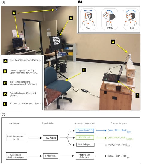 While many head pose estimation approaches have been proposed in the literature, their use in clinical applications or research still remains to be validated []. The previously introduced approaches have been evaluated in terms of computational performance, speed, and ability to identify faces. However, no studies, to our knowledge, assess the HPE accuracy in comparison to a gold standard. The present study thus aims at investigating the accuracy of OpenFace 2.0, 3DDFA_V2 and MediaPipe HPE algorithms using video streams against an optoelectronic motion-capture gold standard. The results can provide an important assessment of the suitability of the approaches for clinical use.