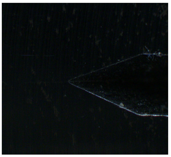 Dark field illumination is conducted by a flat ring light that is mounted very close to the object. The result is that most of the light is reflected away from the camera sensor. The image of the tested subject in Figure 7 shows the type of effect that can be obtained when using dark field lighting. This low angle lighting is ideal for edge detection and damage on metal surface. The gained image has the high purity and quality of expressing details. Regrettably, the area around the fatigue crack is completely dark. In our case, the crack is invisible due to its low profile under the surrounding surface.