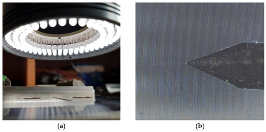 The tested sample was cyclically stressed in the test equipment, (see Figure 3 and Figure 4) and after a certain number of cycles, a fatigue crack began to propagate from the notch. The task was to capture the moment of formation of this crack and, at the same time, measure its size in real time. Despite initial experiments, mentioned NDT methods proved to be unsuitable. Due to the large vibrations, the use of real-time optical image evaluation proved to be optimal.