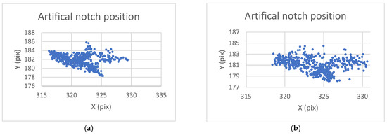 Figure 13a,b shows the difference between possible line finding setups and its effect on tracking of artificial notch position. This setup must be prepared carefully before the test by the testing operator. Parameters of line finding depend on actual specimen and lighting conditions.