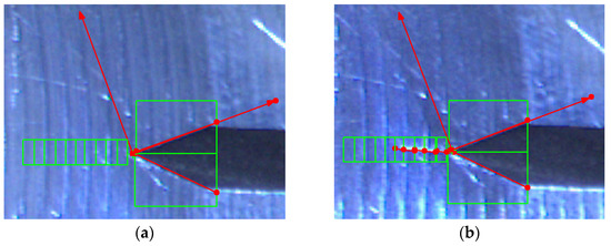 (a) Selection of line search zones (green: detection zones, red: detected lines). (b) Detection of crack in segments (green: detection zones, red: detected lines).