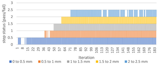 Since the 0.5 mm resolution is sufficient for the detection system output, several 0.5 mm zones of straight-line finding are determined (see Figure 14). Output of this module is pass/fail information about the crack length in 0.5 mm accuracy. When the straight line of the desired length (setpoint) is detected, the system goes into the next state (“Crack approving”) to more detailed inspection of actual frame.