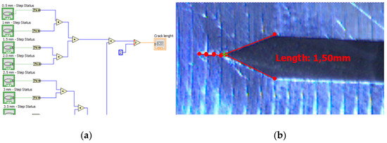 (a) The fragment of the logical operation behind crack length measurement. (b) Numerical interpretation of function “calculator” as custom overlay.