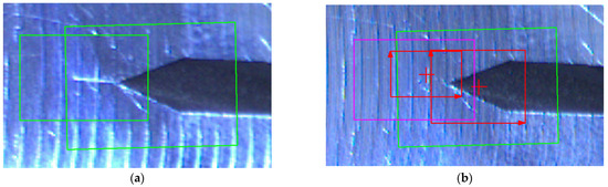 Figure 20a and Figure 21a show two initial patterns (red square) in the region of interest (green square). Once the crack is distinguishable, the “no match” output is signalised (see Figure 20b and Figure 21b).