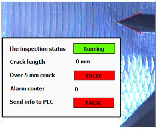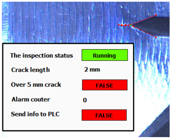 When the crack alarm occurs and is approved, the indicated frame is sent to the operator PC in an archive folder with log file for forthcoming manual inspection. Based on alarm counter setup, the number of saved images is between 3 and 6. If the desired number of alarms is reached, the algorithm sends this status to PLC.