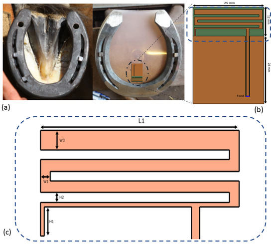 (a) An example of a horse hoof and a horse hoof with the planar pad with the embedded electronics: (b,c) design of the planar IFA antenna; the dimensions in (b,c) design of the planar IFA antenna. The dimensions in (b) are WT = 25 mm, LT1 = 12 mm, and LT2 = 28 mm; in (c) they are H1 = 3 mm, H2 = 1 mm, W1= 1.2 mm, W3 = 2 mm, and L1 = 25 mm, and the width of the short strip is 0.5 mm. The meandering arm continues with this thickness until the first corner after the feedline, thereafter it changes to W1 until the last corner to W3. The gaps between the meandering lines are all H2. The distance between the shorting pin and feed is 18 mm.