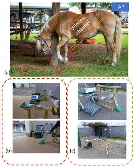 (a) the overall concept of the project; a mobile sensor embedded in the horseshoe communicating the behavioral data of the horse to a access point located somewhere in the pasture the horse resides. This work studies the combined antenna–channel modeling of this situation; (b) shows the constructed pad, the severed horse leg, covered in a hygienic veterinary glove; part of the hoof is uncovered by the glove and the hoof pad is attached to it with tape. The top picture is the air-case setup. The iron is attached by means of the green tape as seen on the ground-case setup, the bottom picture; (c) the path loss measurement setups as discussed in Section 4.1.