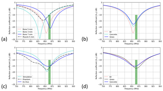 (a) Simulated reflection coefficient |S for the antenna in air. To characterize the impedance robustness, the phantom is modelled as muscle or bone, and the epoxy layer is varied from 3 mm to 7 mm; (b) robustness of the hoof-antenna against the different soil types (simulated); (c) measured reflection coefficient using a phantom leg and an ex vivo leg; (d) measured reflection coefficient with the leg standing on different soil types.