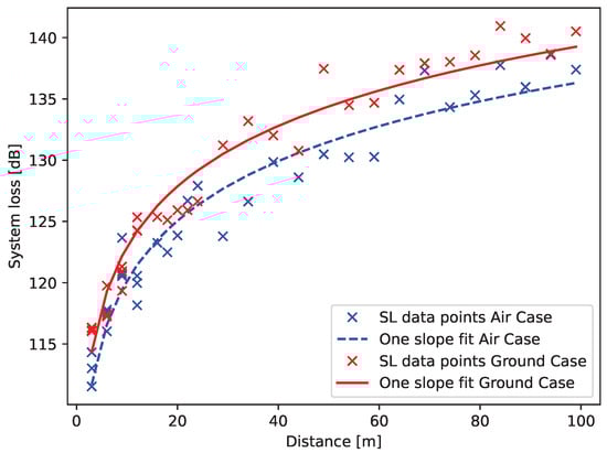 For the two cases, the measured system loss is fitted to the one-slope model, see Equation (1). The resulting propagation coefficients and fading margin are given in Table 3. The fitted model is shown in Figure 6. With LoRa as the considered RF technology, the ranges depending on the case and data rate are listed in Table 2. Here it is shown that the setup is able to reach the targeted range of 250 m with a data rate of 500 bps despite the harsh environment of the antenna. These are obtained using the method described in Section 4.1 and Section 4.2; namely, the system loss models of Equation (1) and Table 3 are used to determine the distance at which the received power becomes lower than the sensitivity in 95% of the cases, i.e., the range. The results are in line with previous literature [18,31]. The significant difference in system loss between the two cases can be explained by the fact that the two cases make use of a different sector of the radiation pattern with different directivity values.