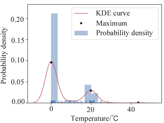 However, the temperature probability density data are discretized, which cannot be used directly. Thus, we need to estimate the probability density function to approximate its specific distribution. The common probability density estimation methods include parametric probability density estimation and non-parameter probability density estimation. Kernel density estimation (KDE) [43] is a non-parameter probability density estimation method used to estimate the temperature probability density distribution of the data.