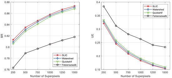 where SP is the number of segmentation results that meet the condition that should be the ground truth. GP is the total number of the segmentation result. The higher the BR denotes the better performance. UE is the ratio of calculated over-segmented superpixels. The more approaches zero of the UE, the superpixel approaches the ground truth. UE is defined as follow