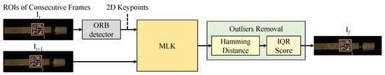 Flowchart of the proposed sparse-optical-flow-based target tracking method. ORB: Oriented Fast and Rotated Brief, MLK: multi-level Lucas–Kanade algorithm, IQR: interquartile range.