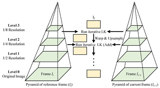 Multi-level Optical Flow Strategy allows the flow field to be estimated at coarser levels and then be fine-tuned by increasing the resolution of images. Adelson et al. [53] investigated the use of the pyramid approach to develop a multi-level optical flow strategy. As shown in Figure 2, the Gaussian pyramid is employed and the resolution of the image is reduced at each level while climbing the pyramid. To develop a multi-level strategy, the number of levels needs to be specified, which is one of the critical parameters used in the image pyramid. A finer level leads to greater accuracy of the algorithm, but it would also lead to a higher cost of computational resources. Another important parameter that needs to be specified is the scaling factor, which determines the extent of downsampling images in the pyramid. As shown in Figure 2, the optical flow is estimated based on a multi-level optical flow strategy with its subsequent warping steps, where a four-level image pyramid is first created for each frame by downsampling the image with the scaling factor of . Then, the optical flow is computed at lower-resolution images, which serves as the initialization for higher-resolution pyramid levels. Due to the brightness constancy assumption, the LK algorithm can only estimate small displacements. Therefore, in this study, the multi-level strategy is combined with the LK algorithm to manage large displacements [23].