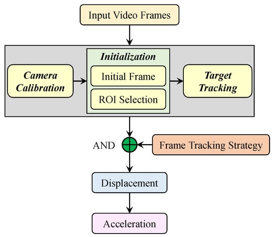 In this study, the visual sensing system used for structural vibration monitoring is based on target tracking techniques. As shown in Figure 3, this system takes the video frames that record the vibration of a structure as an input and outputs the acceleration time histories of the structural vibration. It consists of two components: (i) camera calibration and scale conversion; and (ii) frame tracking strategies and displacement calculation. To save on computational resources, an ROI is defined in the first frame.