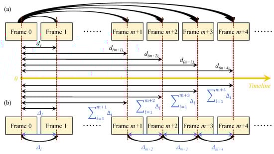 The displacement time history is often calculated by either employing a fixed-frame strategy or an updated-frame strategy [1,55]. The main difference between these two strategies is whether the reference frame is kept fixed or is updated when calculating the displacement for each tracked target. Figure 4a shows the fixed-frame strategy, where the first frame (i.e., Frame 0) is always used as the reference frame. The absolute displacement of each target at every single time instant is calculated by subtracting the location coordinate of the target in Frame 0 from the location coordinate in the current frame (e.g., Frame m + 1, Frame m + 2, Frame m + 3). Figure 4b shows the updated-frame strategy. The displacement decrement between two consecutive frames (e.g., Frame m+1 and Frame m + 2, Frame m + 2 and Frame m + 3) is calculated, and the absolute displacement at every instant of time is the accumulation of all previous . Then, the actual displacements are obtained by multiplying the displacements in pixel coordinates with the calculated scale ratio, s. Finally, the proposed sparse-optical-flow-based target tracking approach is combined with the updated-frame strategy to calculate the acceleration time history.