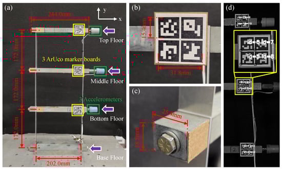 Experimental three-story shear building structure. (a) Overview of the structure; (b) close-up shot of the ArUco marker board fixed on the top floor; (c) left end of the lumped mass steel stick of the middle floor; (d) detected ids of the fiducial markers.