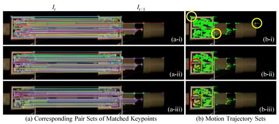 The colored lines shown in Figure 10iii are much more distinct and have greater clarity compared to the lines observed in Figure 10i. This is similar to what we observe in the proposed method as both these target tracking methods employ the same techniques for keypoint detection and outlier removal. However, the matched keypoints using the proposed method shown in Figure 7a are much denser than those obtained using the feature-matching-based method shown in Figure 10b, indicating that the MLK algorithm can find many more matched keypoints than the brute-force method.