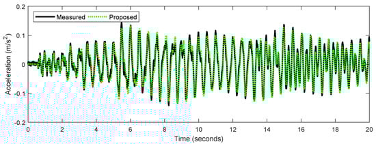 Next, the accuracy performance of the proposed method is evaluated using root mean square error (RMSE). RMSE is a widely accepted evaluation metric in the performance assessment of computer-vision-based vibration monitoring methods. It measures how far the numerical results are around the observed data and is given by Equation (7) [57].