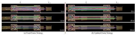 Images in Figure 10a show the results calculated by fixed-frame strategy. In accordance with Figure 4, the fixed-frame strategy uses the first frame, , as the reference frame at all times to calculate the displacements. Images in Figure 10b show the results obtained by using the updated-frame strategy. The updated-frame strategy does not use a fixed frame of reference but rather updates it at each time step, which considers two consecutive frames at any time instance such that the previous frame, , is used as the reference frame. Figure 10i shows pairs of initial matched keypoints in the ROIs of reference frame and current frame, , after implementing the brute-force matching. The colored lines connect the matched keypoints in the ROI of and their corresponding keypoints, 2D position: in . Figure 10ii,iii show the pairs of matched keypoints in the ROIs of reference frame and using colored lines, respectively.