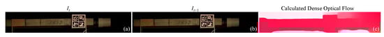 Figure 11 shows a qualitative result after implementing the dense optical flow algorithm on two consecutive frames. Specifically, Figure 11a,b show the ROIs of and , respectively. Figure 11c is the dense optical flow between and , which shows the flow vectors of the entire ROI (all pixels) of . The red color region represents that the object was displaced towards the right, the green color region represents that the object was displaced towards the left, and the white color region represents that the object was not displaced. The pixels with more intensity represent that the object was displaced more. As shown in Figure 11a,b, the top floor was displaced towards the right from to , which has the same moving direction (red region) shown in Figure 11c. For these red areas, some of the areas that overlapped with the vibrating structure display the same pixel intensity, which means that these areas of vibration on the building model have the same motion.