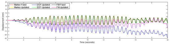 To demonstrate this phenomenon, fixed-frame and updated-frame strategies are utilized and compared as part of the vision-based vibration monitoring methods. Figure 12 illustrates the calculated displacement time history of the middle floor when the three-story shear building structure is subjected to an excitation frequency of 2 Hz. The displacement time histories calculated by using the updated-frame strategy (marker-updated, FM-updated, DOF-updated, and SOF-updated) show the error accumulation when compared to the results calculated by using the fixed-frame strategy (marker-fixed and FM-fixed). It can be seen that the proposed methodology (SOF-updated) has negligible drift when compared to the existing vibration monitoring methodologies [9,16] that use the updated-frame strategy.