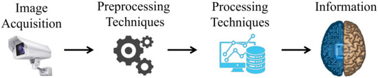 The first stage is responsible for frame capture, followed by signal preprocessing and the application of corresponding techniques for localization, classification, or detection. In the first stage, individual or joint optical sensors convert the light reflected by the objects into arrays of pixels representing the scene. The next stage, which may or may not exist depending on the system, is preprocessing. Here, the image is prepared for feature extraction using techniques for noise reduction, deblurring, feature intensification, and image quality enhancement [8].