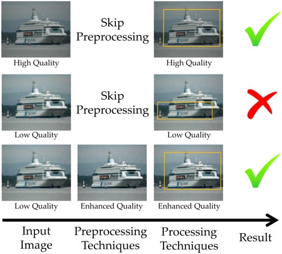 Among the various techniques that can be used in preprocessing, it is possible to mention super-resolution techniques [11,12] and deblur [13,14]. The main benefit of improving images before they are used in location, classification, or detection models is usually the improvement of accuracy achieved only by increasing the quality of the dataset [15]. An example of detection enhancement can be seen in Figure 2.