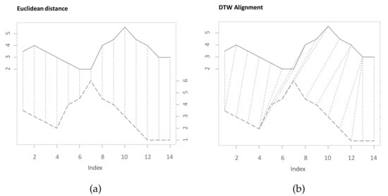 For identifying similarities between two variables, it is often important to take their temporal developments into account. While analogies between time series might be contemporaneously, there are several cases where similar phases occur lagged or with different durations. To quantify similarities between time series, one common measure is the Euclidean distance. While it can be relevant to measure contemporaneous similarities in time series, the distance is not well suited in case of differences in the time dimension [1]. Dynamic Time Warping (DTW) is an algorithm that efficiently determines the nonlinear alignment of two time series that is optimal with respect to a set of criteria [2,3,4,5]. Thereby, the algorithm is not distorted through differences in the time domain, such as leads or lags. Figure 1 shows different alignments for two time series that both share common values and progressions, which, however, do not occur simultaneously. In Figure 1a, the presented alignment through the Euclidean distance is non-intuitive, and the time-shifted similarity between the time series is therefore underappreciated. Figure 1b depicts the capability of DTW to match and compare similar shapes and to thus quantify the similarity of these two time series more realistically. The comparison between Euclidean distance and DTW is also highlighted by Keogh and Pazzani [1]. Details about the theoretical concept, functionality, and application areas are described in Section 2.
