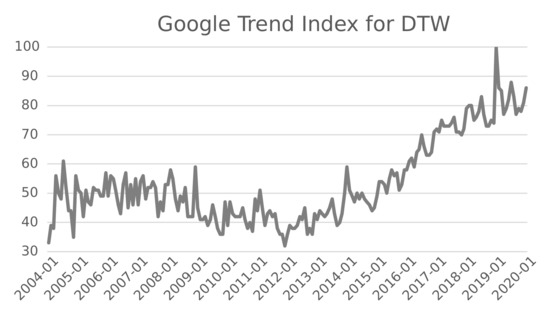 Dynamic Time Warping is becoming more and more popular. This statement is confirmed by Google Trends, which is a website that analyzes the popularity of top search queries in Google Search across various regions and languages. Figure 2 represents the Google Trend Index for DTW during the time span from 2004 to 2020. We observe a fluctuating interest until 2010 and a strong growth of attention during the last decade.