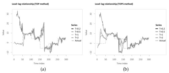 The TOP and TOPS method show conceptual similarities towards DTW. These two former are equally based on a local cost matrix, which is referred to as “distance matrix” or “energy landscape” by Meng et al. [6], Sornette and Zhou [38]. The authors calculate the local cost matrix as in the case of the classical DTW. They then introduce a parameter referred to as temperature T, which allows for extracting information of multiple warping paths for . For a value of , the TOP method corresponds to classical DTW in finding an optimal warping path between prefix series, yet not the entire series. This is explained in the lead-lag estimation at each time for the TOP method only depending on previous observations. Thus, the lead-lag estimates at rather likely do not fully correspond to the globally optimal warping path of classical DTW that considers the entire time series.