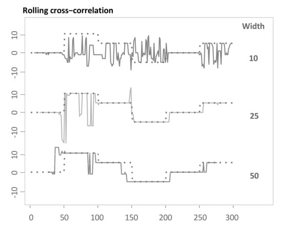 Gupta and Chatterjee [42,50] also propose a detection for discovering lead-lag relationships over rolling subsequences in similar spirit to shapeDTW. However, it uses a correlation-based distance measure instead of Euclidean or Manhattan distance, which therefore cannot be reduced to classical DTW and does not work for small subsequence lengths. Therefore, the two papers set the subsequence length to values of at least 25, which might miss higher-frequency changes in the lead-lag relationship.