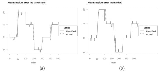 Thereby, in order to mitigate the symmetry issue, the lead-lag relationship is plotted as is (“Identified (5)”) and with reversed insertion (“Identified (5 rev.)”) (see Figure 17a). Additionally, the lead-lag relationship using subsequence length of 3 (“Identified (3)”) is also included to show whether the results are robust to slight changes in the parameter. Thereby, positive values of the lead-lag relationship describe the situation, where the US business cycle is estimated to lead the German one and negative values indicate the opposite. Keeping in mind the results of the assessment criterion MoMAE within the simulation study, the estimated values for non-strong relationships showed notable average deviations from the true underlying relationship. Therefore, the concrete values are to be interpreted keeping this in mind and further research should focus on introducing measures for confidence intervals. Figure 17b shows the calculated alignment between the two inputted time series, underlining the alignment quality of the method.