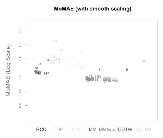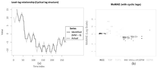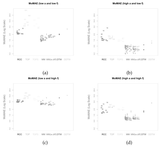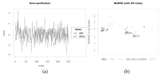 Overall, the robustness checks underline the findings of Section 5.2. Both main methodologies are outperforming the alternative methods for the majority of parameter values, and the lowest MoMAE is still always achieved by one parameter setting of MM or MM(w.diff). Again, the MoMAE values over all parameter constellations of the main methodologies are bundled very close. The robustness checks also show that, for all three checks, the levels of MoMAE for both main methodologies rose, indicating that the robustness checks increased the difficulty of accurately and swiftly identifying the actual time-varying lead-lag relationships. Generally, for identifying frequent and short-lasting lead-lag relationships, small values of the main methodology are preferable. Again, small does not refer to values of 1, which would correspond to classical DTW, as the inclusion of neighbourhood information proves valuable basically throughout the simulations. However, for more complex noise patterns, as with "AR noise", higher values of the subsequence length are superior due to increased robustness. The inclusion of first differences becomes valuable in case similar phases persistently deviate in their levels after Z-normalization, where then value-independent shape characteristics become more important. This latter finding is in line with further research on this topic [4,11].