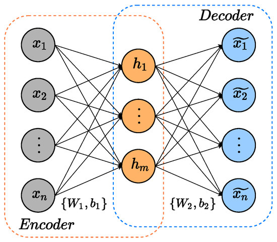 The mean square error (MSE) among and represents the training loss function of AE as Equation (3) illustrates. The learning process adjusts the parameters set to minimize the reconstruction error: