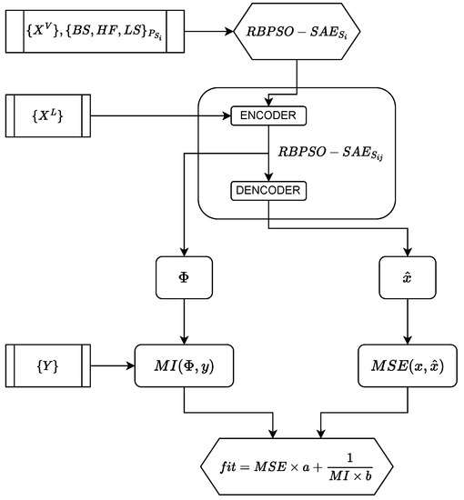 Step 4.3. This work evaluates each of the obtained RBPSO-SAE models regarding their ability to extract features and how relevant those features are for the main goal of the model, which is virtual sensing tasks. First, the proposal calculates the MSE between real and targeted outputs from the test set, evaluating the model’s performance. Second, MI analysis among target outputs and the model’s output performs the representation-based evaluation. All of the RBPSO-SAE models receive the labeled dataset as input, then they generate a representation-based output , which are the high-level extracted features from the input data. The MI analysis of the nonlinear relationship among features of and the targeted-output values Y regarding Equation (6). The higher the MI value is, the greater the relevance of the analyzed feature to estimate desired outputs. By using MSE and the mean of MI values, , the approach presents a fitness function (Figure 3) used to measure the appropriate level of each model as follows: