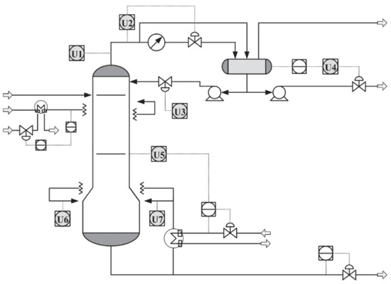 The debutanizer columns are regular devices that process desulfurization and naphtha cracking in oil and gas refineries [42]. Withdrawing propane (C5) and butane (C4) from naphtha steam is the primary goal of such an apparatus. Consequently, the lower the amount of butane, the better the quality of the naphtha end products. However, no physical sensors can measure the amount of butane in real-time. One solution is to use soft sensors to estimate the butane concentration simultaneously. Figure 4 illustrates the debutanizer column and its devices. The squares containing gray circles represent the hardware sensors that measure process variables such as flow, pressure, and temperature. The purpose of the debutanizer column used is to remove C3 and C4 from naphtha steam. Reducing the C4 concentration increases the quality of the final product located at the bottom of the debutanizer column. Gas chromatographs measure C4 concentration. However, due to a long measurement interval, they cannot provide real-time C4 concentrations for monitoring and control purposes. As explained earlier, soft sensors can estimate real-time measurements unavailable from physical sensors, such as C4 concentration. In [43], the dataset and more process details are available.