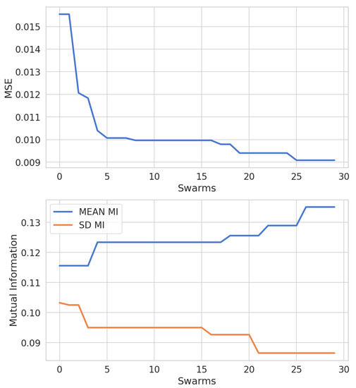 Figure 5 illustrates the behavior of g-best particle, which means the best-obtained SAE model through the generated swarms, regarding the fitness criteria: mean square error and mean of MI values between extracted features and targeted output. By observing the graph of the evolution of the MSE, the mean, and the standard deviation of the MI, we can notice the following: There is a sharp drop in the MSE value between the first and the fifth swarm, stabilizing between the sixth and the sixteenth swarm. Finally, it decreases from the seventeenth swarm and returns to stability at the twenty-sixth. The mean MI value starts stable, but there is a noticeable increase between the third and fourth swarm. Soon after, it remains stable between the fifth and the sixteenth swarm and then acquires a rising behavior until the twenty-sixth swarm. MI’s mean and standard deviation values start stable, showing a decrease between the second and third swarms. Next, its value remains stable between the fourth and fifteenth swarm. Finally, it shows a falling behavior between the sixteenth and twenty-first swarm, and then remains stable. The increase in the mean MI value and the decrease in the MSE value and MI standard deviation along the swarm’s evolution imply improvements in the projected SAE performance. A lower MSE value of the validation implies a better generalization. As well as a higher value of the mean of the MI, we obtain more representative features. A smaller value of the MI standard deviation means minor variation in the quality of the features extracted from the data. Thus, the previous graph proves the efficiency of enhanced-proposed PSO application in adjusting hyperparameters considering its evaluation of MI.