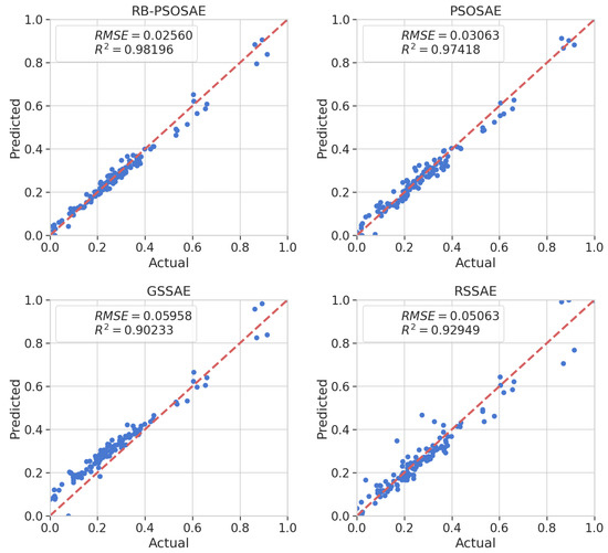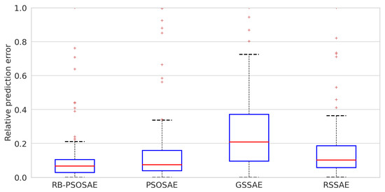 Figure 6 demonstrates the prediction results from the test dataset using parity plots. Again, RB-PSOSAE showed higher accuracy, as expected, compared to the other methods. In addition, Figure 7 illustrates the relative prediction errors with boxplots of the four methods, RB-PSOSAE, PSOSAE, GSSAE, and RSSAE, in descending order of performance. The box edges indicate the 25th and 75th percentiles, while the red mark in the center represents the median value within each box. The larger the box’s width, the more dispersed the prediction errors. The upper and lower whiskers represent maximum and minimum values. The narrower box range of RB-PSOSAE indicates better prediction performance among the four compared methods mainly because RB-PSOSAE, through its evaluation function, can select the most relevant representations, extract nonlinear features, and handle process dynamics. Nonetheless, there are uncertainties to be considered in industrial processes [13,44], so Figure 7 shows some outlines represented individually by red dots. Inadequate initial parameters and discrepant values result in improper soft sensors with high relative prediction error. In contrast, acceptable soft sensors obtain stationary relative prediction errors for the same data set. Thus, stationary error values show the robustness of the model [13,45]. Therefore, the soft sensor designed by the RB-PSOSAE achieved better performance, reliability, and robustness.