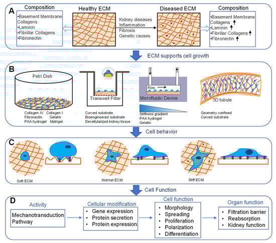 Kidney-on-a-chip models have wide-ranging applications for studying fundamental renal physiology, drug screening, disease modeling, and tissue engineering. It has become increasingly clear that incorporating mechanical signals into organs-on-a-chip is important in many organs and tissues, including the kidney []. These stimuli can be passive and include modulating substrate stiffness, composition, topography, or geometry. Additionally, the application of externally applied forces such as FSS has wide-ranging effects on cell differentiation and function. Pathological mechanical signals can also be incorporated into in vitro devices to model acute or chronic kidney diseases. Kidney injury can alter transient fluid flows and shear stresses in the glomerulus or the tubule, and chronic injury can alter ECM mechanics or composition. Modeling these effects in microfluidic and 3D cell culture models may provide insight into normal kidney physiology and guide therapeutic approaches to mitigate kidney damage in response to acute or chronic damage.