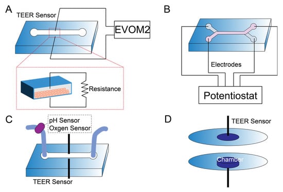 Sensor integration into kidney-on-a-chip with schematics of TEER measurement using (A) EVOM2 instrument and (B) four terminal sensing techniques using a potentiostat. TEER sensor measures the resistance across the cell layer. (C) Multiple sensors, such as pH and oxygen sensors, are integrated into microfluidic device with TEER measurements. (D) Bioreactors with small chambers are integrated with TEER sensors.