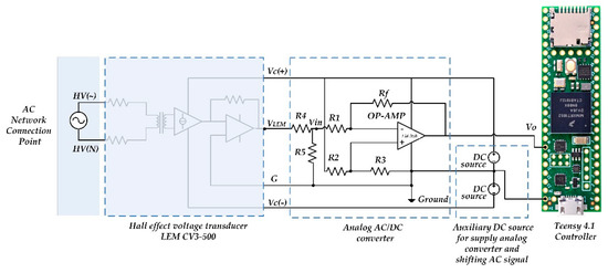 Following the methods of the RMS voltage estimations presented here, the set of laboratory measurements was carried out to verify the accuracy of all submitted approaches. For the verification of the RMS measurement approaches and comparison between different suggested methods, the laboratory setup was created (Figure 3 and Figure 4). It includes the laboratory AC voltage source DRTS 33 [36], which is able to simulate real AC voltage with an arbitrary harmonic content, and the voltage transducer CV 3-500 [37], which translates high instantaneous network voltage amplitudes to low-voltage signal. The analog converter developed by authors scales and shifts the output voltage of the transducer CV 3-500 to the analog A/D input through the use of a Teensy 4.1 controller. The resistive components in the analog converter have the following magnitudes: R1 = 15.54 kΩ, R2 = 15.32 kΩ, R3 = 1 kΩ, and Rf = 9.88 kΩ.