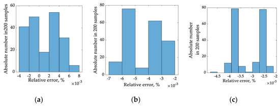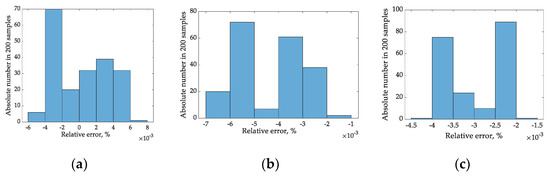 Histograms of a relative RMS estimation error for sampling time 5 ms (a), 7 ms (b), and 9 ms (c).