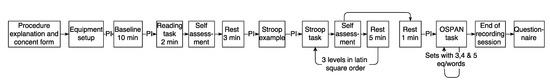 Figure 1 depicts a chart of the progress of tasks, instructions, self-assessment questionnaires and resting periods implemented in the experiment. The flow chart depicts all elements included in the experiment such as the OSPAN test (see [40]) and reading task, but the focus in this particular paper is on the Stroop tasks.