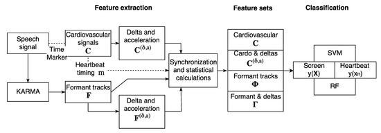 The cardiovascular features and the formant features are processed further to enrich the representation with a dynamical context and to fuse these two information sources together for a joint classification. Figure 2 depicts the feature extraction, synchronization process, feature set combinations and classification schemes introduced. A richer dynamical context is achieved by calculating the so-called delta and acceleration features and the feature level fusion is attained by calculating formant statistics around each heartbeat. This is outlined below.
