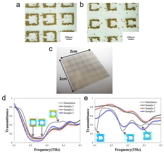 Kashiwagi et al. proposed a similar THz metamaterial made with an array of SRRs, using inkjet printing of silver nanoparticles [57]. Inkjet printing provided a simple, robust and cost-effective way of fabricating the SRR arrays on flexible paper and plastic substrates, as is shown in Figure 1a–c. In this work, six different designs with line widths of 50 µm, 100 µm and 150 µm, and capacitive gaps of 50 µm and 100 µm were fabricated and analysed. A total of 48 SRR sensors were fabricated per six different SRR patterns. The fabrication error was minimal for 100 µm and 150 µm line widths and 100 µm capacitive gap. The resonance frequencies were observed at 0.27 THz and 0.37 THz using THz time-domain spectroscopy (THz-TDS) characterisation. Figure 1d,e demonstrates the transmission spectra of the SRRs for x- and y-polarised incident waves. A good agreement was observed between the simulation and experimental results, as is evident from the transmission spectra shown in Figure 1d,e. This multi-resonance sensor can be utilised for low-cost biosensing applications such as viruses, proteins and other biomarker detection.