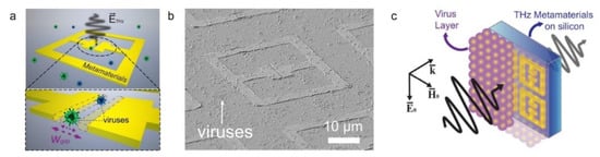 (a) Schematic illustration of nano-gap metamaterial structure for THz sensing of viruses. (b) SEM image of the viruses deposited on the structure with a gap width (w) of 200 nm. (c) Schematic depiction of the measurement of the dielectric constant of virus layers using the THz metamaterial structure [59] © 2017 Optical Society of America.