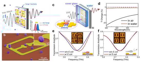 The detection of microorganisms has been studied for decades. Several organisms, such as bacteria and fungi, are responsible for life-threatening diseases in humans, including tuberculosis, asthma [61], gonorrhoea and meningitis [62]. Therefore, early identification of these microorganisms is crucial to preventing the spread of infections and treating them efficiently. Park et al. reported a THz biosensor to facilitate accurate and faster detection of such organisms. A detailed overview of the device is provided in [60] and illustrated in Figure 3. The THz wave propagation through the MM sensor was analysed in response to fungi, which was bound to the metamaterial resonator split gap (length 2–3 µm). SEM images of the penicillia-coated metastructure are portrayed in Figure 3a,b. Furthermore, the work was extended by detecting the E. coli bacteria in an aqueous medium. Figure 3c denotes a schematic of the experimental setup and Figure 3d shows the percent transmission change in different media. Moreover, antibody functionalisation was found to be crucial for improved sensitivity. Figure 3e,f depicts the transmission spectra with and without anti-E. coli functionalisation on the sensor surface. The shift in resonance frequency was minimal without anti-E. coli functionalisation [60].