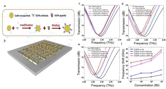 The sensitivity of MM-based THz biosensors can be further enhanced by adding gold nanoparticles (AuNPs) to a metal film. In this regard, Liu and his colleagues provided an efficient approach to increasing sensitivity to EGFR (epidermal growth factor receptor) in the THz regime using a bow-tie metamaterial array [65]. EGFR is critical in the diagnosis and prognosis of tumour tissues, cancer cell-like gastrointestinal cancer, lung cancer and oral squamous cell carcinoma regrowth rate [66,67]. The proposed MM-based biosensor reported in [65] had a bow-tie structure comprising an array of chromium (20 nm) and gold (Au) (100 nm) bilayer films coated with AuNPs, which provided an extraordinary sensing performance. The geometrical design along with the chemical functionalisation on the metamaterial structure are depicted in Figure 4a,b. Furthermore, shifts in the resonance frequency were analysed for different AuNP diameters. It was evident that increasing the diameter of the AuNPs enhanced the resonance frequency shifts. Figure 4c–e demonstrate the transmission spectra of the bow-tie structure in response to varying concentrations of EGFR when coated with AuNP sizes of 5 nm, 15 nm and 25 nm. The frequency shift increased with increasing AuNPs size when the sensor was functionalized with antibody. Figure 4f portrays the frequency shifts with EGFR concentrations with and without antibody functionalisation for different AuNPs size. The authors suggested that the sensitivity could be tailored by optimising the MM design with a low absorption substrate such as a thin film of silicon nitride instead of the bulk Si substrate [68]. Besides protein detection, this design can be also reconfigured for detecting cancer cells and bacteria [65]. A different type of bow-tie plasmonic antenna apertures was also reported in [69].