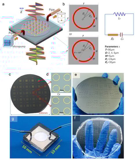 (a) The sketch of THz SRR biosensor integrated with a microfluidics chip. (b) RLC equivalent circuit of the SRR. (c–g) Fabrication steps of the microfluidics integrated SRRs. (c) SRRs on a 4-inch silicon wafer. (d) Four units of the SRR structure with one or two gaps. (e) The SU-8 mould for microfluidics chip fabrication. (f) PDMS microchannel. (g) The final biosensor chip integrated with microfluidics. © 2017 Springer Nature, Zhaoxin Geng, et al. [71].